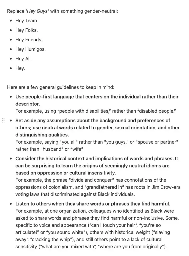 Here’s a screenshot taken from the Notion page provided to employees that outlines some of the ways we’re incorporating more inclusive language: