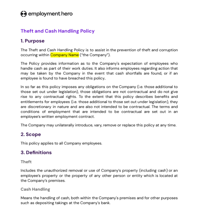 The information in this template is current as at 1 September 2025, and has been prepared by Employment Hero Pty Ltd (ABN 11 160 047 709) and its related bodies corporate (Employment Hero). The views expressed in this template are general information only, are provided in good faith to assist employers and their employees, and should not be relied on as professional advice. The Information is based on data supplied by third parties. While such data is believed to be accurate, it has not been independently verified and no warranties are given that it is complete, accurate, up to date or fit for the purpose for which it is required. Employment Hero does not accept responsibility for any inaccuracy in such data and is not liable for any loss or damages arising either directly or indirectly as a result of reliance on, use of or inability to use any information provided in this template. You should undertake your own research and to seek professional advice before making any decisions or relying on the information in this template.