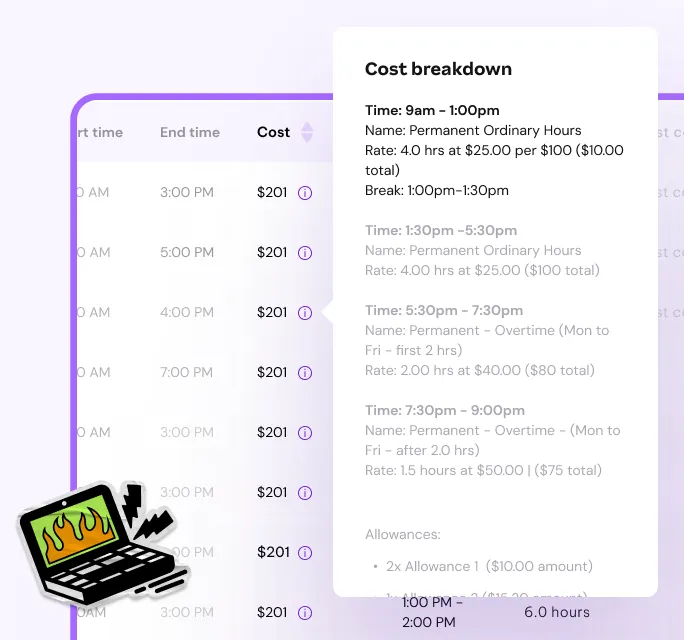 Wondering how shifts are calculated on timesheets? Easily understand how the costs of shifts compare to the pay run. You can even see which pay condition rule set was triggered for each shift.