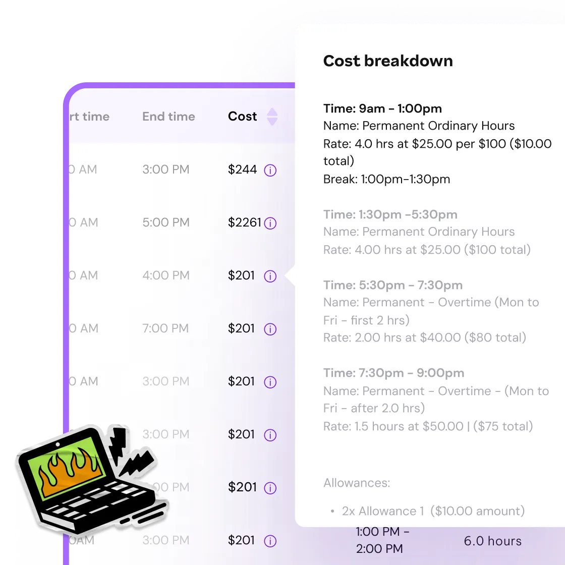 Set up unique payroll scenarios for employees including overtime rates and allowances, automatically reflecting projecting roster costs. The roster will automatically detect public holiday rates, overtime, leave, and unavailability.