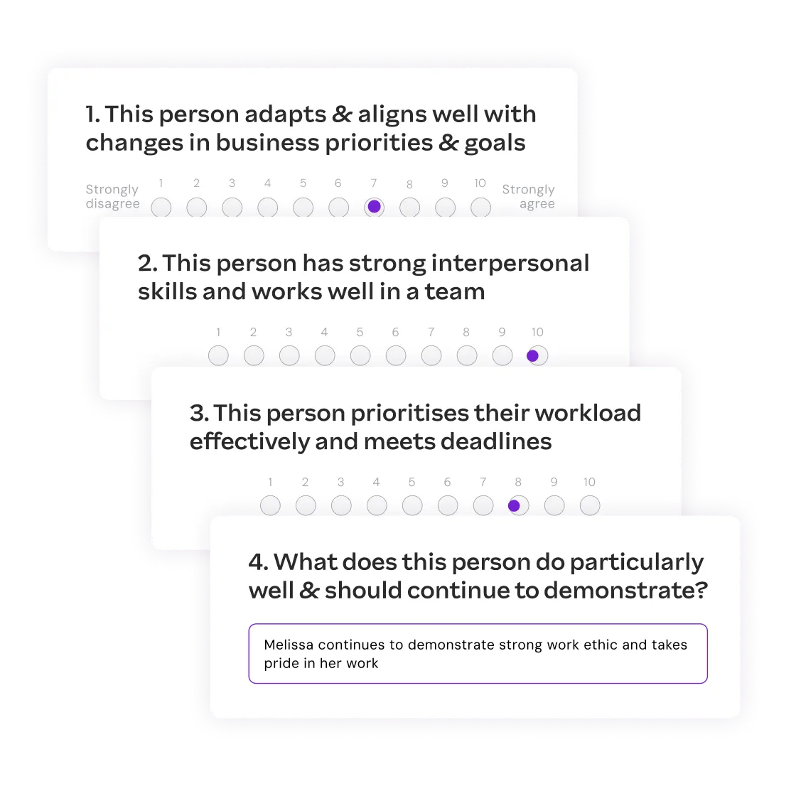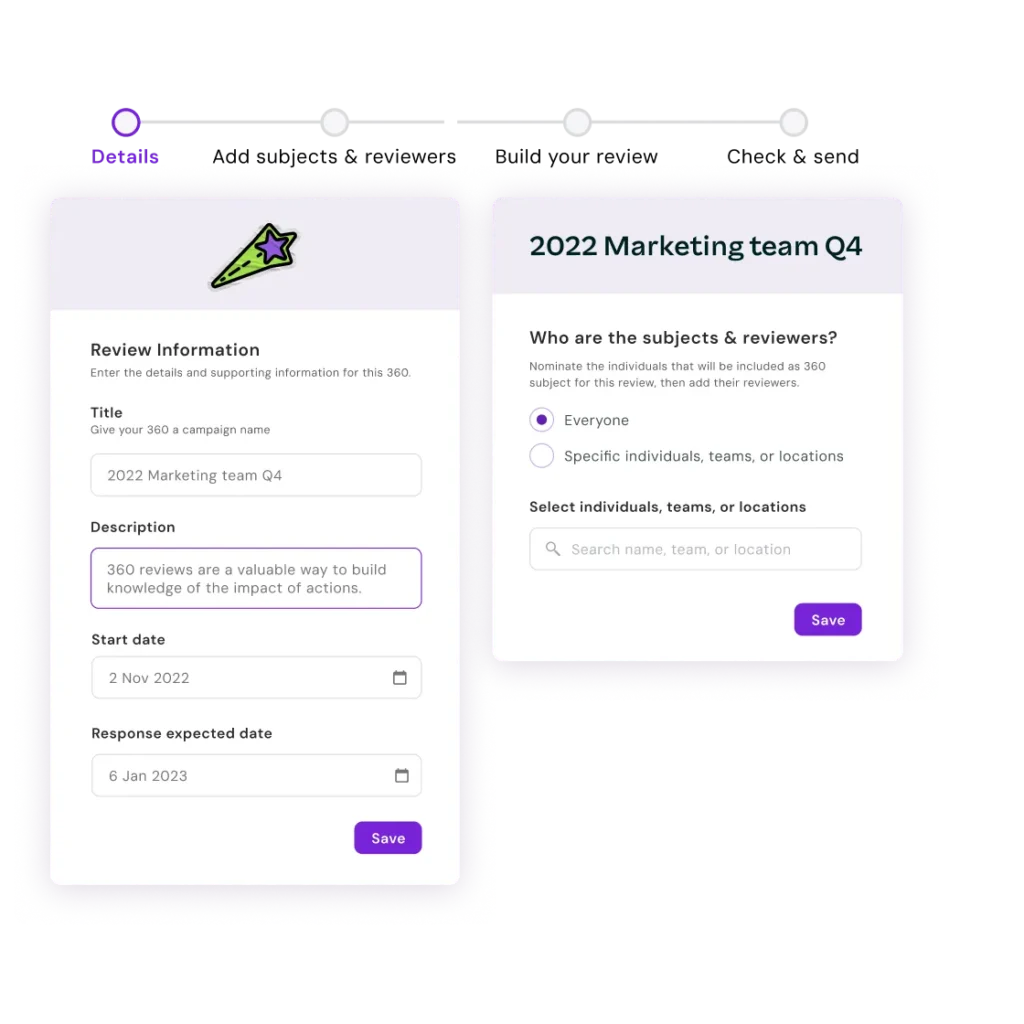 Develop performance review templates with custom rating scales.