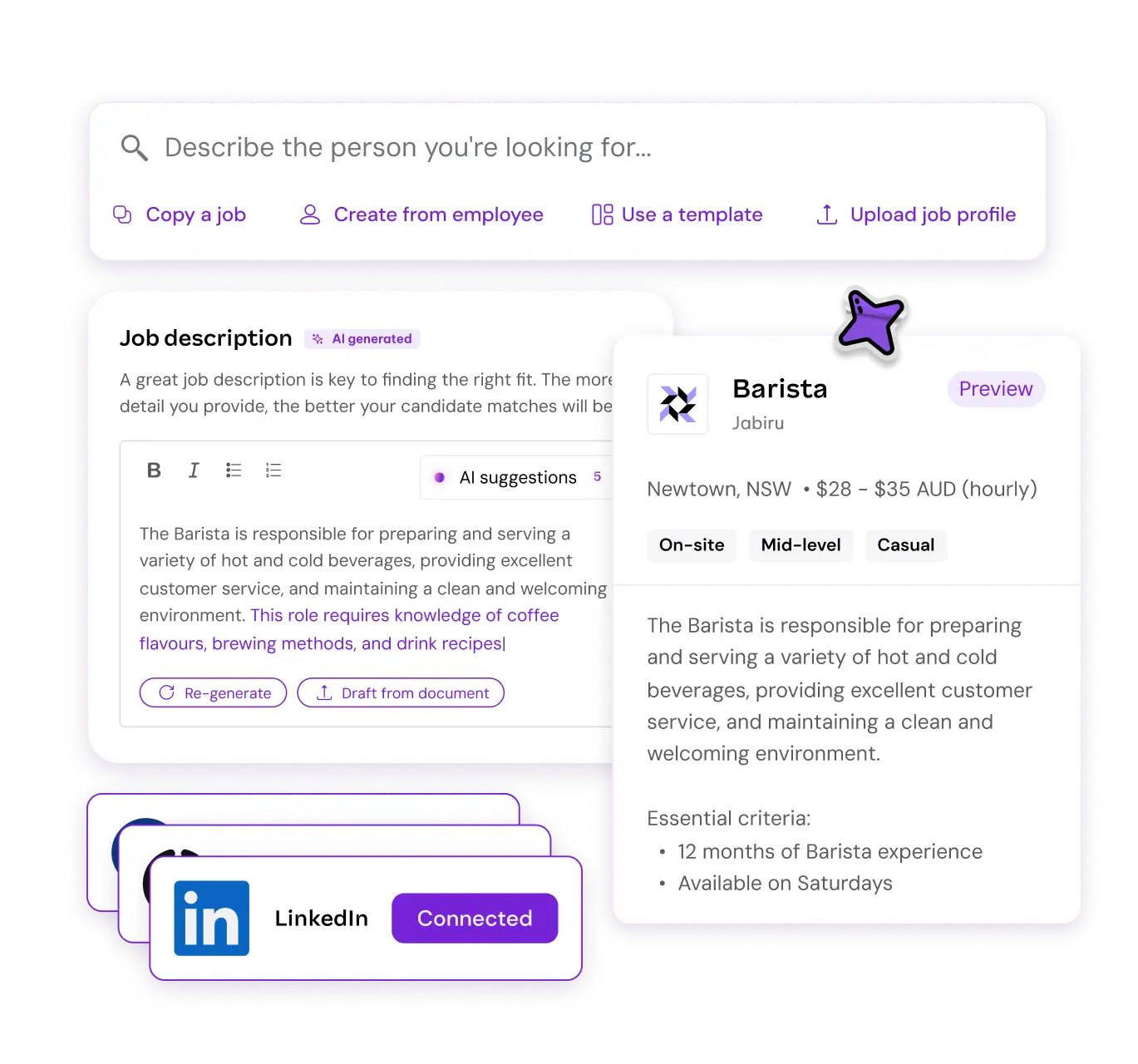 With integrations to all major job boards, custom career pages, and access to Employment Hero’s talent pool of 1.5M+ jobseekers you’ll never miss out on good talent.