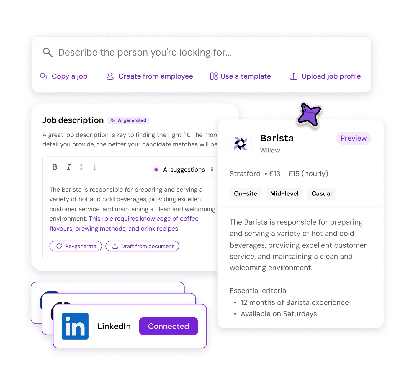 Forget switching tabs and logging in. Create and post roles, manage candidates, reference, contract and onboard in one place.