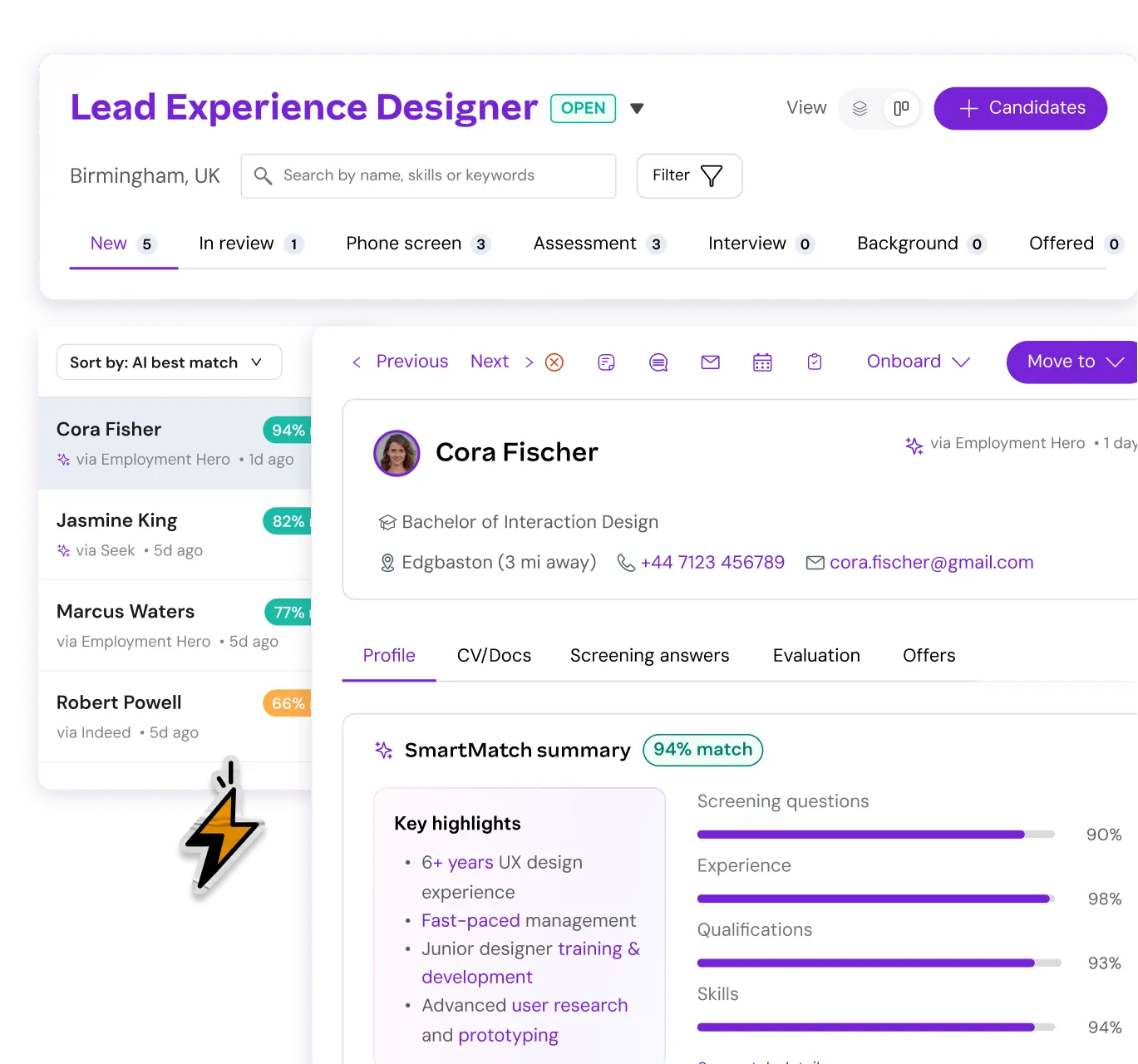 Stop spending hours sifting through irrelevant applications. Just review shortlists of talent curated for every role in your business. With candidate scoring and engagement data, you can see why someone is a great fit at a glance.